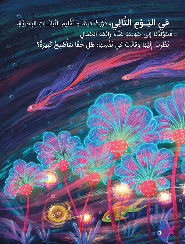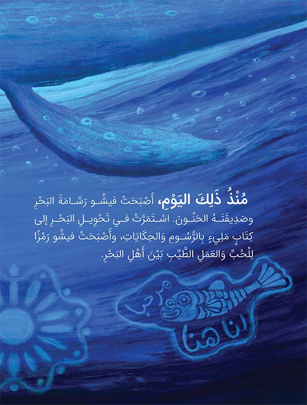 “السّمكة الرسّامة” قصة ساحرة تأخذ الطفل إلى أعماق البحر الأزرق حيث تعيش فيشو الصغيرة بين الشعاب المرجانية. علاوة على ذلك، تفتح القصة أمام القارئ عالمًا غنيًا بالألوان والكائنات البحرية الودودة. ومن خلال هذا الفضاء الجميل، تبرز حكاية سمكة صغيرة تحمل أحلامًا كبيرة. كما تعكس القصة مشاعر الطموح والرغبة في التميز. وهكذا يتعلّم الطفل أن صِغَر الحجم لا يمنع كِبَر الأثر.